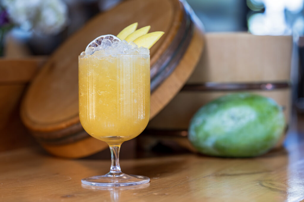 - Garnish with a slice of mango and a piece of crystallized ginger.